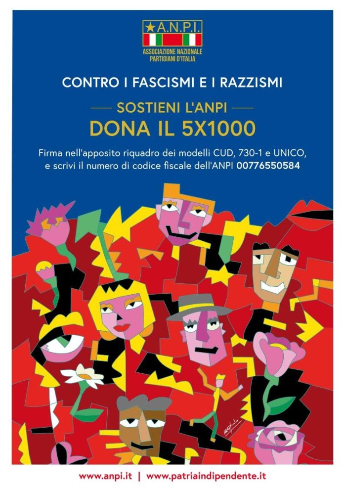 L’ANPI vive del contributo dei suoi iscritti. Destina il 5X1000 firmando nell’apposito riquadro dei modelli CUD, 730, UNICO e scrivendo il numero di Codice Fiscale dell’ANPI 00776550584. E’ un gesto semplice ma importante.
