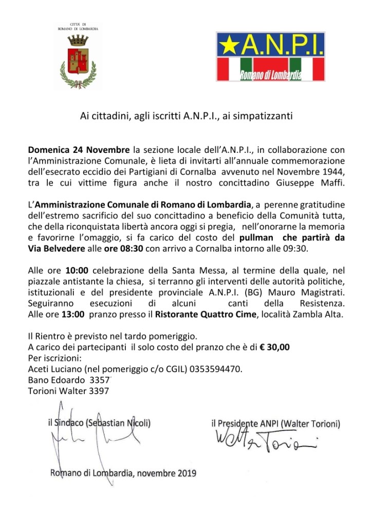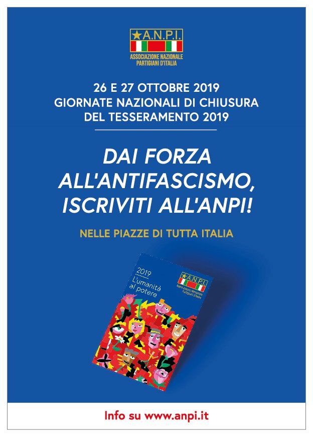 ANPI ha indetto due giornate di mobilitazione straordinaria per incontrare i cittadini ed offrire loro l’opportunità di iscriversi alla nostra associazione. ANPI Romano di Lombardia Giovedì 24 ottobre sarà in Piazza Roma, a Romano, dalle 8 alle 12 e Domenica 27 nel piazzale di Via Duca D’Aosta antistante la Farmacia Comunale, stesso orario.